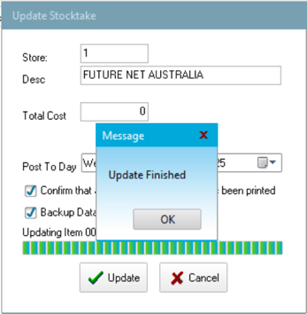 The update process may take considerable time depending on stocktake size and PC performance. Do not force quit the task or restart the PC, even if it displays "NOT RESPONDING". If you have concerns during the update, Contact Future Net support at help.futurenet.com.au/support