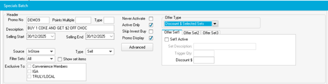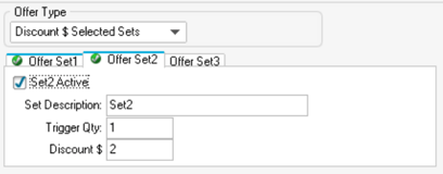 Set 2 Configuration (the discounted item): 1. Tick Set2 Active 2. Enter 1 in Trigger Qty 3. Enter the dollar discount amount in Discount $ (e.g., 2.00 for $2 off) 4. For cold promotions, use the Cold field