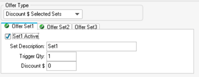 Set 1 Configuration (the purchase requirement): 1. Tick Set1 Active 2. Enter the Trigger Qty (number of items needed) 3. Leave the discount value at 0