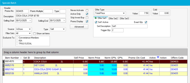 Superseding offer promotions let you run two tiered offers on the same items - a good offer and a better offer. For example: "Coca Cola 2L 2 for $7.50 or 3 for $10."