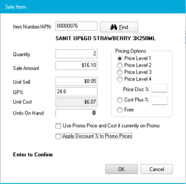 When adding an item, select the appropriate pricing option to ensure the correct sell price or promotion amount is applied.