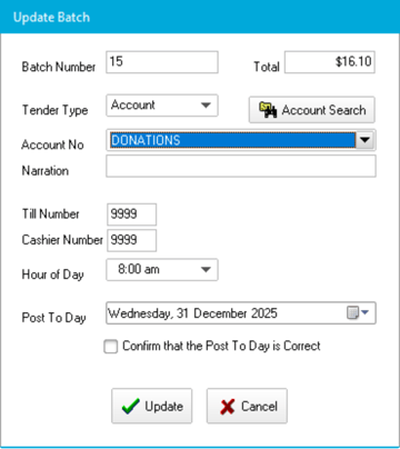 | Tender Type | Select payment method (Account, Cash, etc.) |