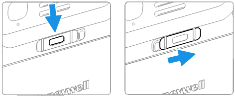 Unlock the battery cover. Press and hold down the small button on the battery latch and then slide the latch to the right