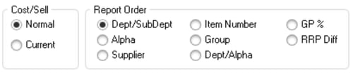 - In Report Order, select how the report will be sorted. Dept/SubDept is the default, sorting by department number, then sub-department number.
